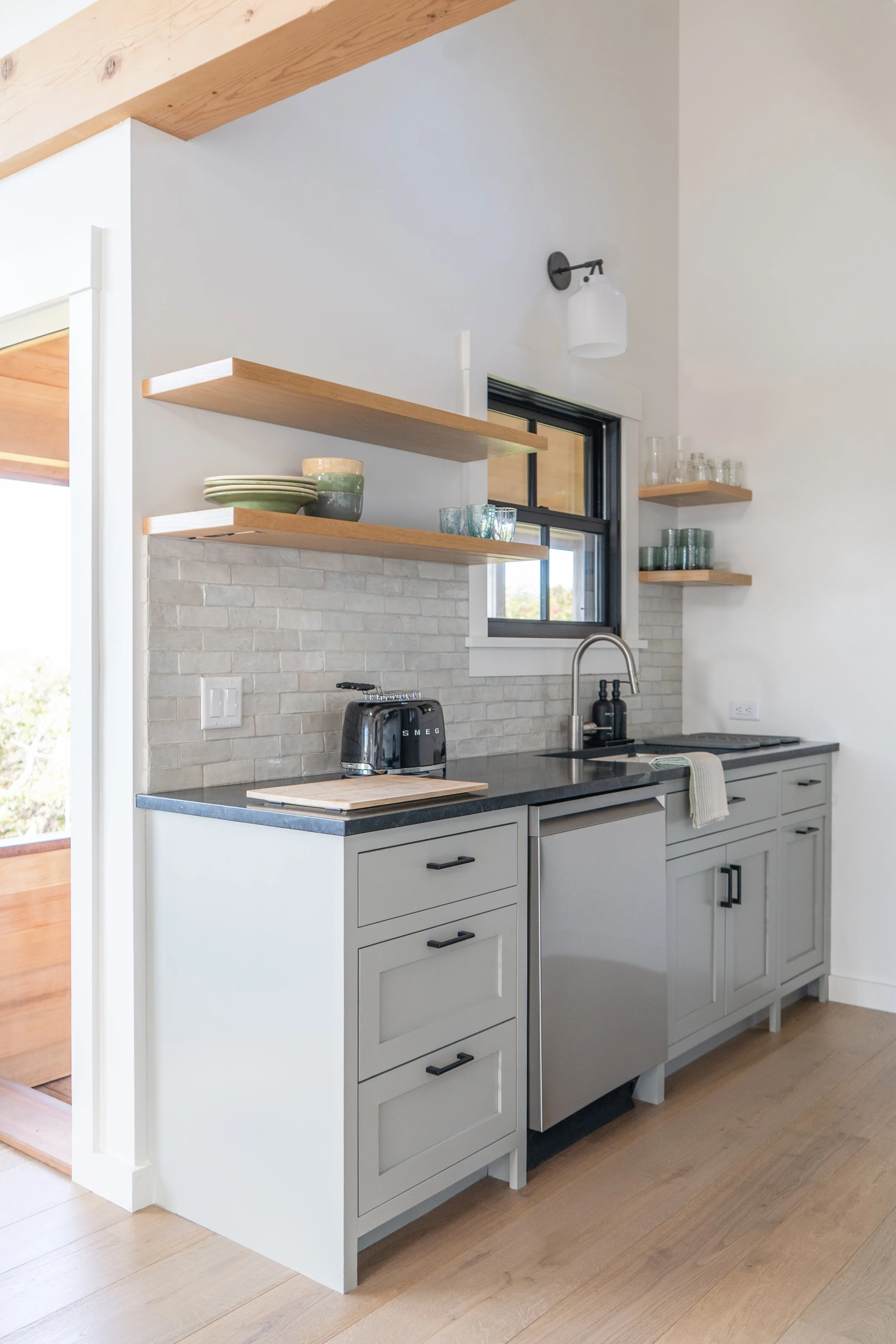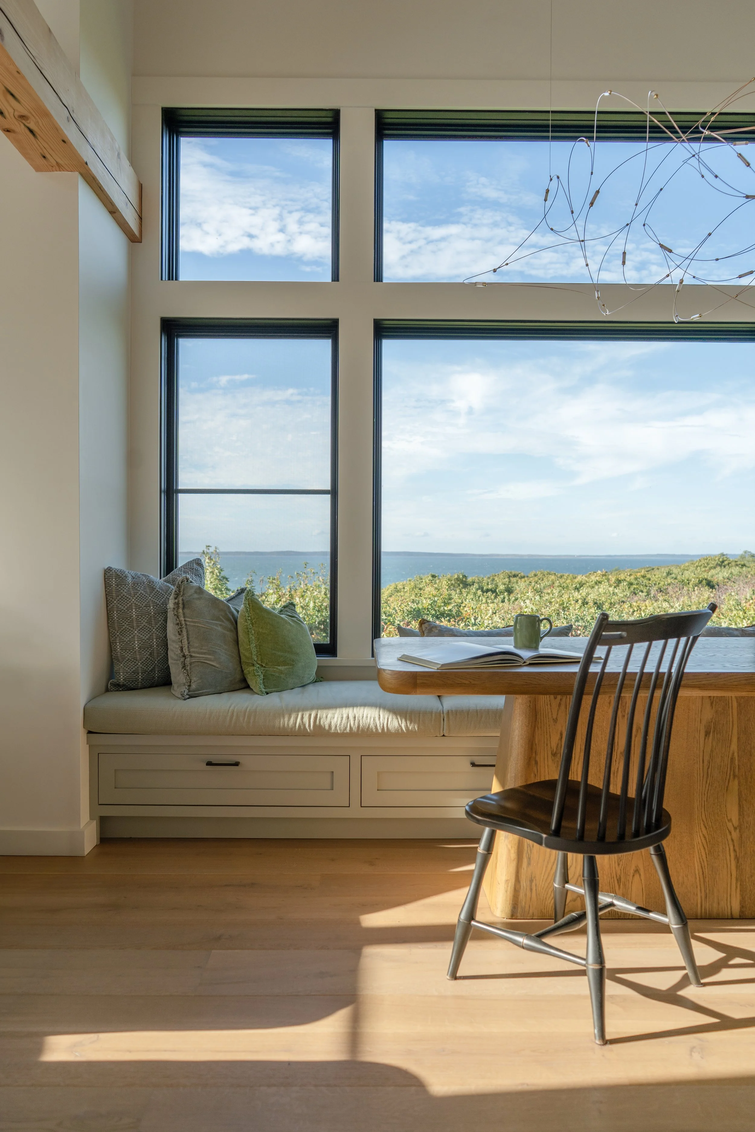 Without any increase in square footage, this guest house was reimagined to embrace its remarkable setting. Perched on a hillside, this renovation introduced expansive glazing to capture over 180° of ocean views with a reconfiguration of the interior that created a light and airy flow that remains warm and inviting throughout the seasons.